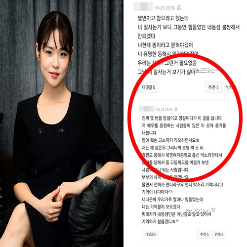 A 씨의 언니인 B 씨는 지난해 5월 심은우 관련 기사에 심은우가 동생을 괴롭혀 가족 모두가 힘들었다는 내용은 담은 댓글을 단 바 있습니다. 학교 폭력, 왕따 폭로가 이어지고 있는 현재보다 훨씬 이전에 글을 남긴 것입니다.