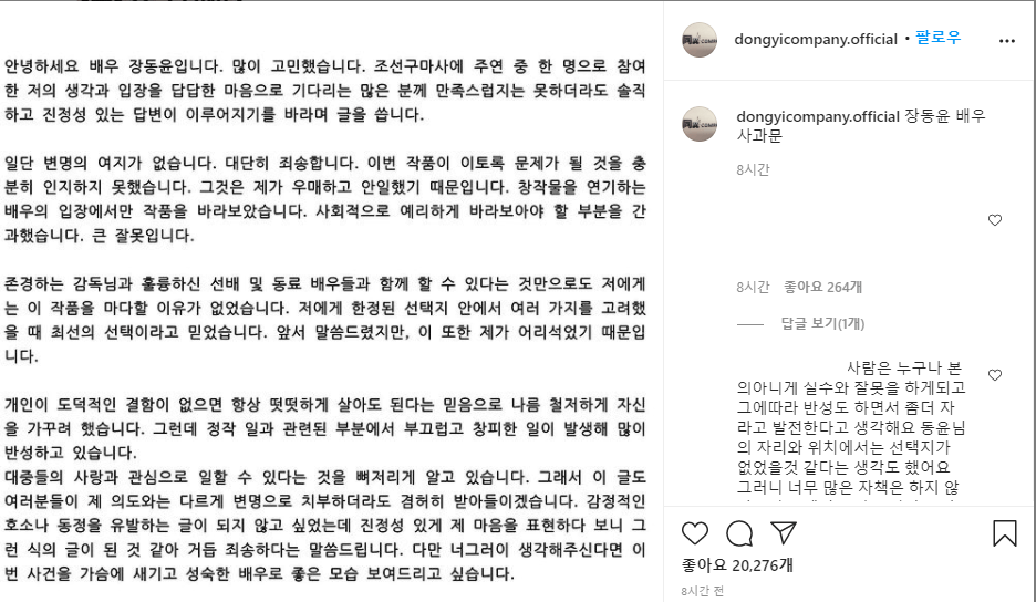 장동윤은 "이번 작품이 이토록 문제가 될 것을 충분히 인지하지 못했다. 그것은 제가 우매하고 안일했기 때문이다. 창작물을 연기하는 배우의 입장에서만 작품을 바라봤다. 큰 잘못"이라며 "존경하는 감독님과 훌륭하신 선배 및 동료 배우들과 함께할 수 있다는 것만으로도 저에게는 이 작품을 마다할 이유가 없었다. 제게 한정된 선택지 안에서 여러 가지를 고려했을 때 최선의 선택이라고 믿었지만, 이 또한 제가 어리석었기 때문"이라고 해명했습니다.