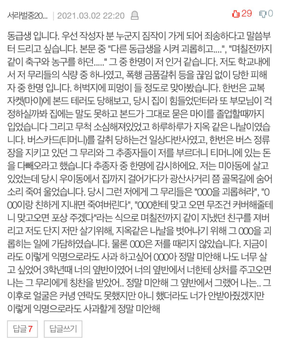 지수에게 학폭을 당했다는 내용은 "교실 쓰레기통에 방뇨했다", "중1 때 체험학습 후 돌아가는 지하철에서 기분이 나쁘다는 이유로 따귀를 때렸다", "시험지를 주고 대신 시험을 치르게 했다" 등의 내용이었습니다.