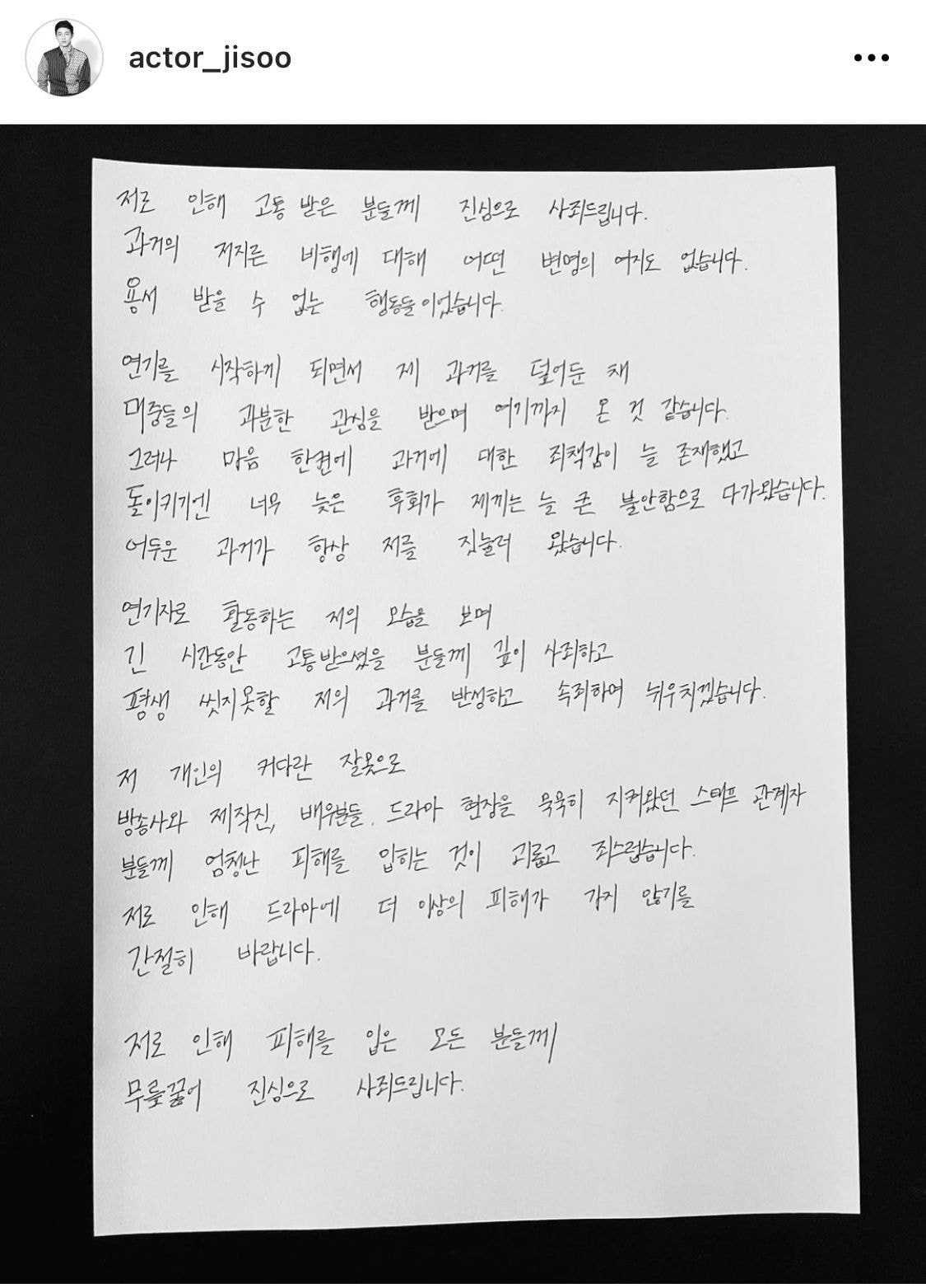지수는 4일 자신의 인스타그램에 자필 사과문 사진을 올리고 "저로 인해 고통받은 분들께 진심으로 사과드린다"고 전했습니다.