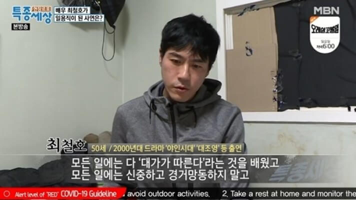 이후 최철호는 여러 드라마에서 간간이 얼굴을 보였지만 눈에 띄는 히트작이나 관심을 가질만한 배역을 보이지는 못했는데요. 새로운 도전을 위해 사업을 하다 실패했고, 결국 택배 상하차 일용직을 하며 생계를 유지하는 상황까지 직면하게 된 셈입니다.