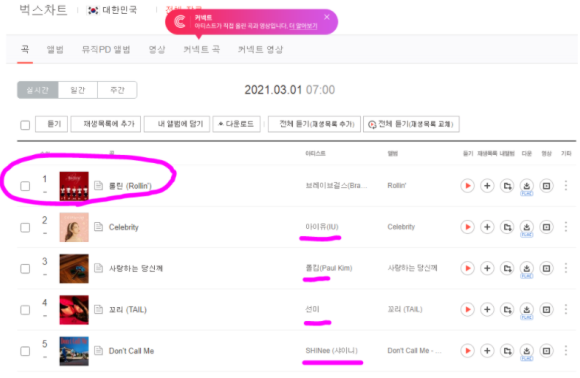 3월 1일 벅스 차트, 아이유, 폴킴, 선미, 샤이니를 다 이겼다.