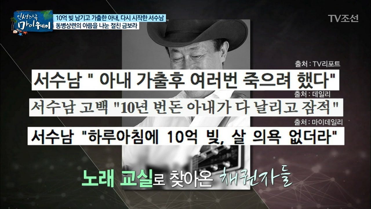 서수남 : "내 인생에서 가장 큰 시련이었다. 가장 큰 절망감을 줬다. 삶의 의욕을 송두리째 빼앗아갔다. 18년 전(2018년 7월 마이웨이 출연 당시 기준) 아내는 모든 재산을 탕진했고, 빚까지 10억을 남겨뒀다. 노래교실에 채권자들이 찾아올 때까지 아내의 부채를 전혀 알지 못했다"