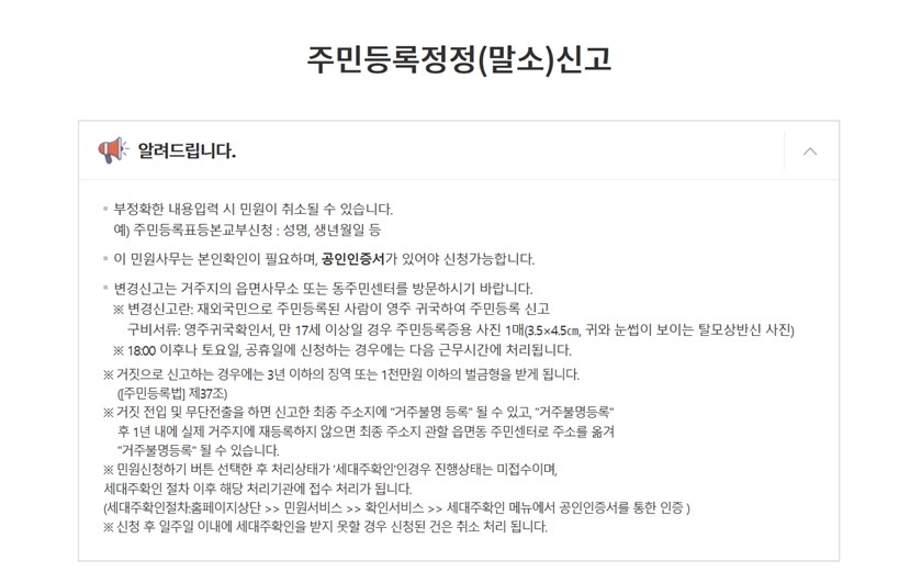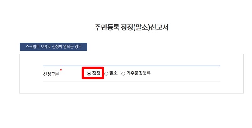 이제 본격적으로 세대주 변경방법을 진행할 수 있는데요. 주의사항을 넘긴 뒤 주민등록 정정(말소)신고서 구분을 선택할 수 있습니다. 여기서 정정 항목을 선택해 줍니다.