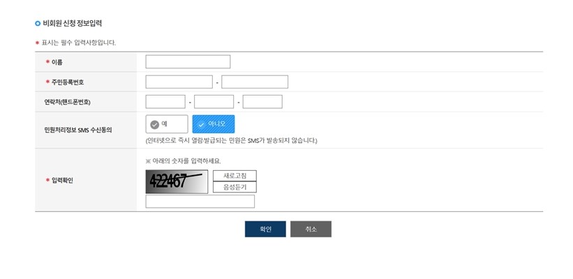 신청하기를 클릭해 세대주 변경방법 다음 단계로 진행할 수 있는데요. 신청자의 선호에 따라 회원/비회원 신청을 선택한 뒤 신청을 위한 각 항목들에 대해 동의를 진행해준 뒤 세대주 변경신청을 위한 정보를 입력해주면 되는데요.