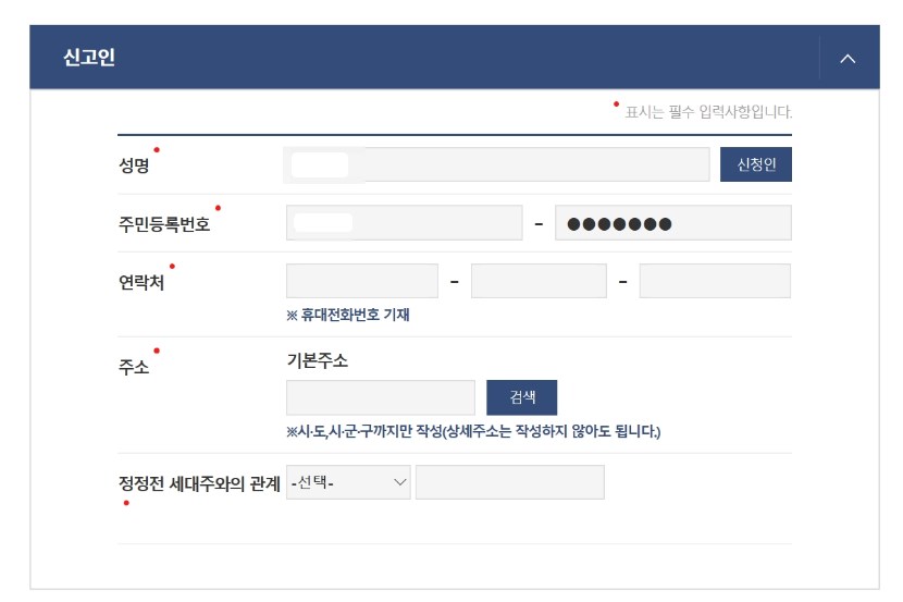 그 후 신고인의 성명, 주민등록번호, 연락처, 주소 등 기본 인적사항을 입력한 뒤에 정정전 세대주와의 관계를 선택해 줍니다.