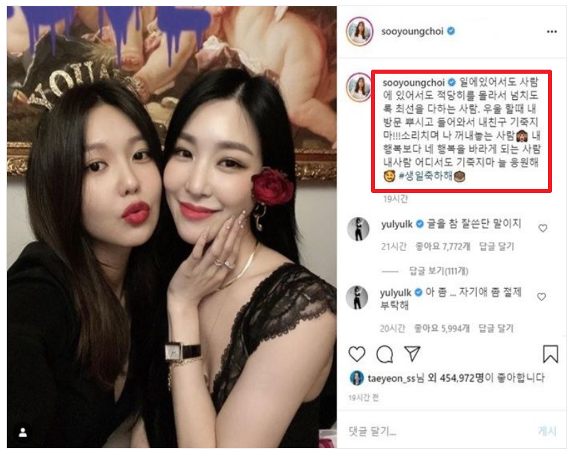 유리는 수영의 게시물에 "글을 참 잘 쓴단 말이지"라며 감탄사를 남기기도 하고 자신의 인스타에 파티 사진을 공개하며 "제일 소중한 친구들아 사랑해"라는 멘트로 우정을 드러냅니다.