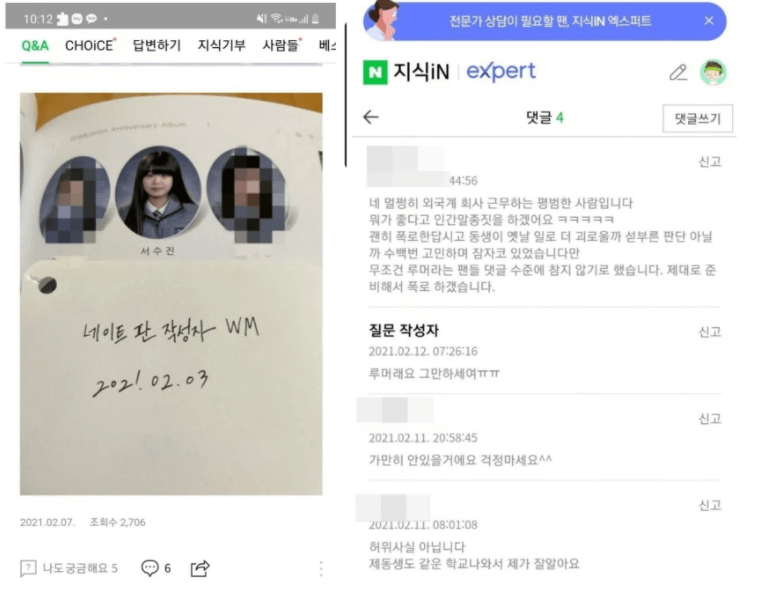 대학생 온라인 커뮤니티 에브리타임에서도 폭로가 나왔습니다. 피해자 B씨는 “걸그룹 여자아이들 잘 되고 유명한 거 꼴 보기 싫다. 중학생 때 나 왕따시킨 X이 그 그룹에서 제일 잘나가던데. 진짜 소름끼치고 화가 난다”라며 수진의 졸업사진을 올렸습니다다.