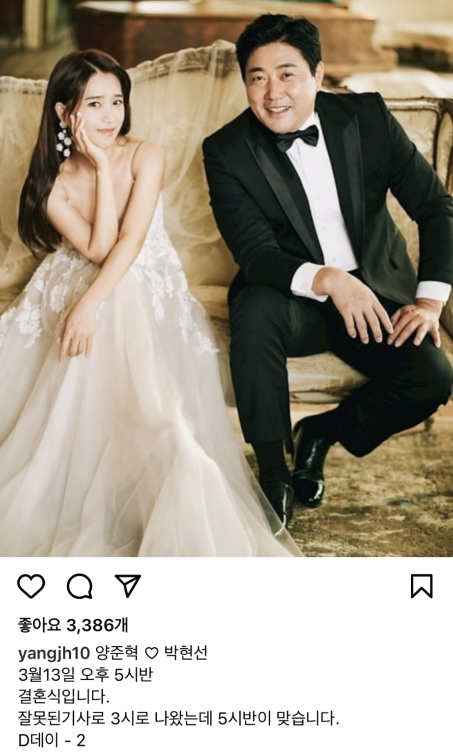 양준혁은 자신의 인스타그램을 통해 "양준혁 박현선 3월 13일 오후 5시 반 결혼식입니다. 잘못된 기사로 3시로 나왔는데 5시 반이 맞습니다"라는 글과 함께 한 장의 사진을 게재했습니다.