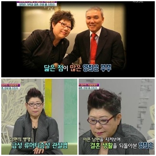 양희은: "어느 날 남편이 차 시동이 안 걸린다더라. 손목도 못 움직이는 상태가 시작이었고 류마티스성 관절염이 왔다.