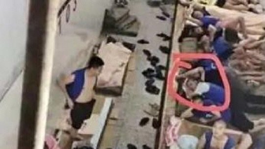 사진은 위에서 촬영된 것으로, 철창 속 남성들은 파란색 상의와 검은색 바지를 입고있는 남성들이 비좁게 누워 있는 모습입니다.