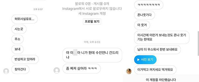 A씨는 "인정을 받는 사과를 받든 가해자 측 관계자 분드로가 이야기를 나누는 것에 긍정적으로 생각해봤다. 어차피 양측 가해자와 피해자가 대면 할 수 없다면 글을 직접 게시한 제가 변호사님을 대동하여 만나는 쪽으로 이야기 나눴다"며 억측고 비난을 자제해달라는 말과 함께 2차 가해자들이 보낸 메시지를 일부 공개했습니다.