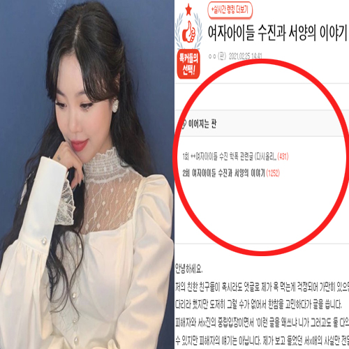 25일 한 온라인 커뮤니티에서는 '(여자)아이들 수진과 서 양(서신애)의 이야기'라는 제목의 글이 게재되었는데요, 해당 글의 작성자 A씨는 제가 보고 들었던 서신애의 사실만 전달하겠다'며 "(수진이) 아이들과 친하게 지내다가 중학교 2학년 때 무리에서 멀어지면서 은따(은밀히 따돌림)을 당했다.