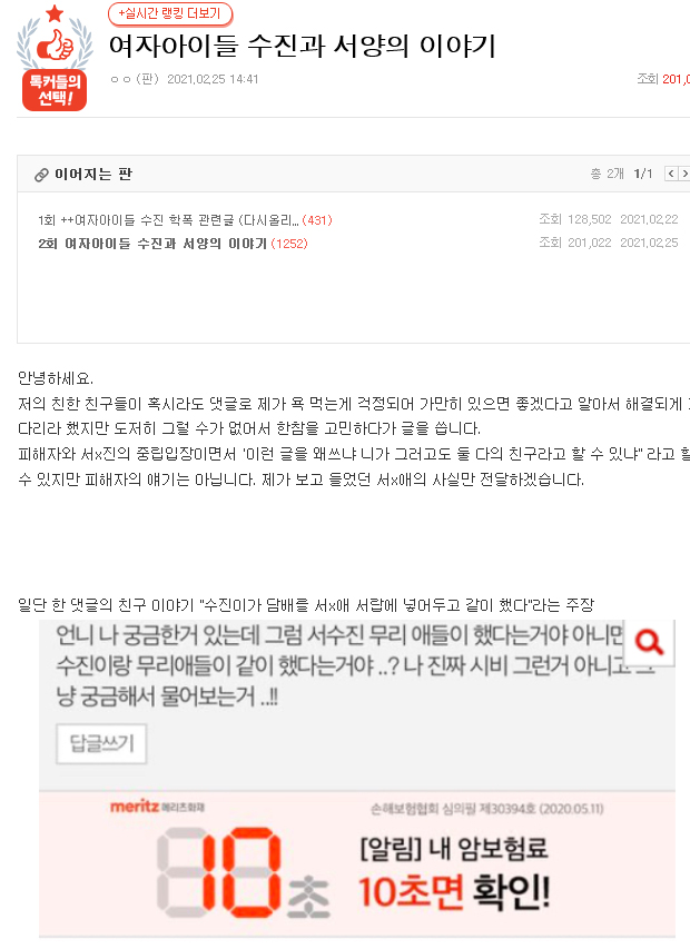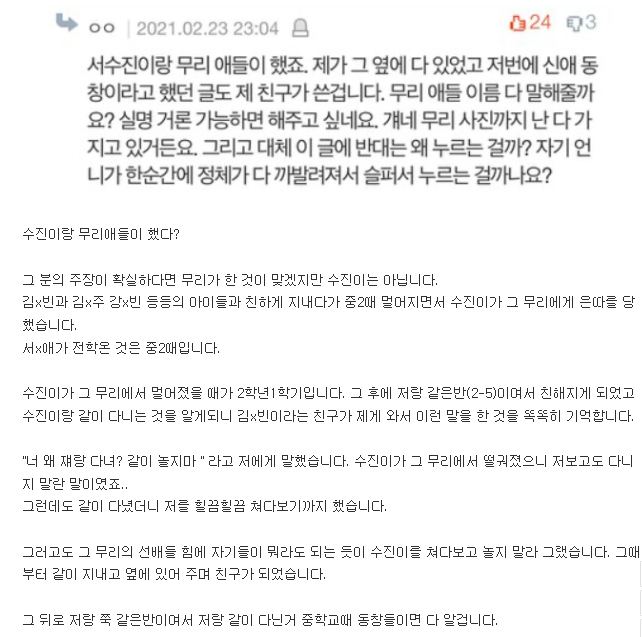 23일 온라인 커뮤니티에는 수진 학폭 최초 폭로자인 A씨가 장문의 글을 게재했습니다.