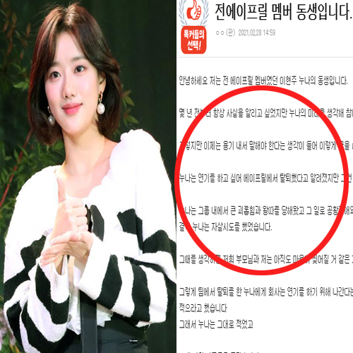 이나은의 왕따 논란은 최근 한 온라인 커뮤니티를 통해 불거졌는데요, 에이프릴 출신 이현주의 친동생이라고 주장하는 A 씨가 활동 당시 채경과 레이첼을 제외한 에이프릴 멤버들에게 괴롭힘과 왕따를 당했다고 폭로한 것인데요, A 씨는 이로 인해 이현주가 공황 장애를 앓았고, 극단적인 선택 시도를 했다고 주장했습니다.