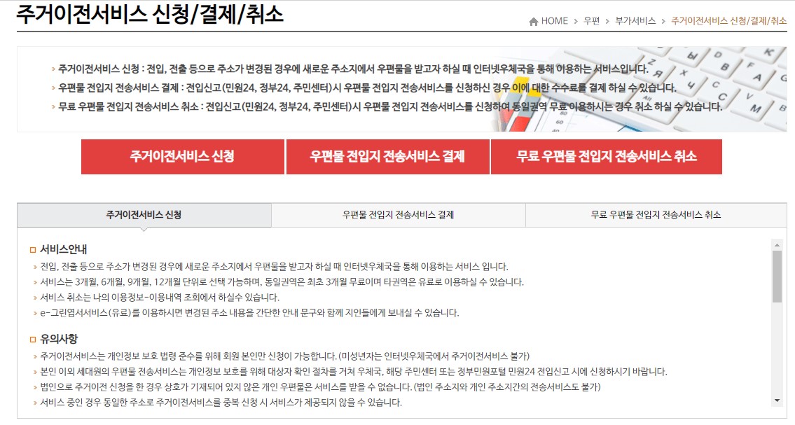주거이전서비스는 현재 개인고객에 한해서 신청이 가능합니다. 사업자라면 우체국을 직접 방문해야 하는 번거로움을 감수해야 합니다.