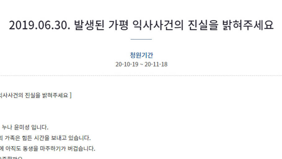 윤상엽씨의 누나 윤미성씨는 2020년 10월 19일 청와대 국민청원 게시판에 ‘2019. 06. 30. 발생된 가평 익사사건의 진실을 밝혀주세요’라는 제목의 청원 글을 올렸습니다.