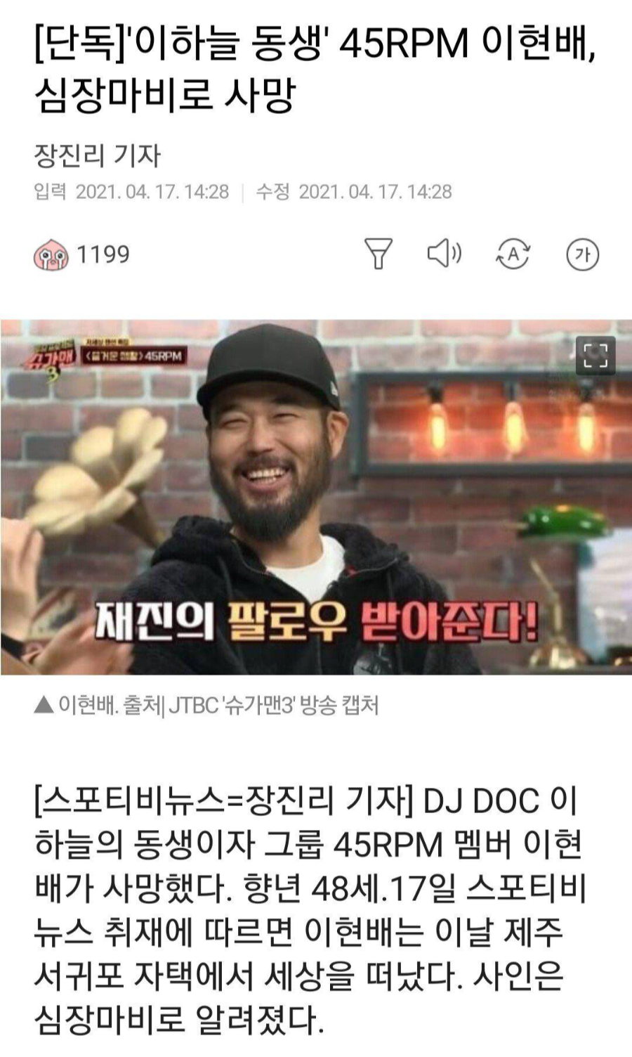 故이현배는 지난 17일 제주 서귀포 자택에서 숨진 채 발견돼 충격을 안겼습니다. 부검 결과 심장이상 소견이 나왔으나 정확한 사인은 아직 밝혀지지 않았습니다.