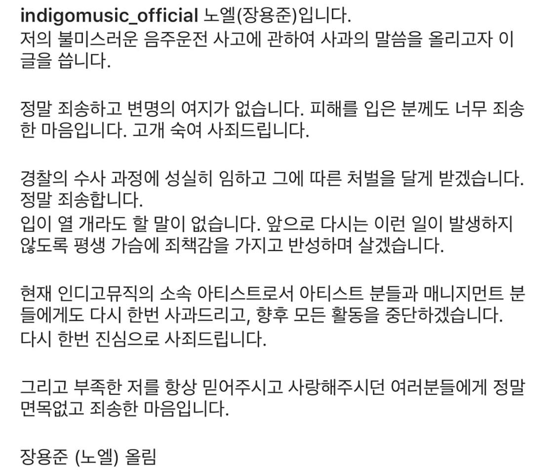 장용준(노엘)은 소속사 공식 인스타그램을 통해 사과문을 전달했고, 해당 사건 이후에 자숙기간을 갖고 향후 모든 활동을 중단한다고 밝혔습니다.