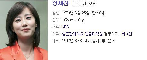 정세진 아나운서는 연세대학교 영어영문학과를 졸업한 뒤 1997년 KBS 24기 공채 아나운서로 입사해 199년부터 7년 간 KBS 1TV 9시 뉴스의 앵커를 맡았다고 KBS 1FM `노래의 날개 위에` DJ와 1TV `한국 현대사 증언, TV 자서전` 내레이션을 맡았었다.