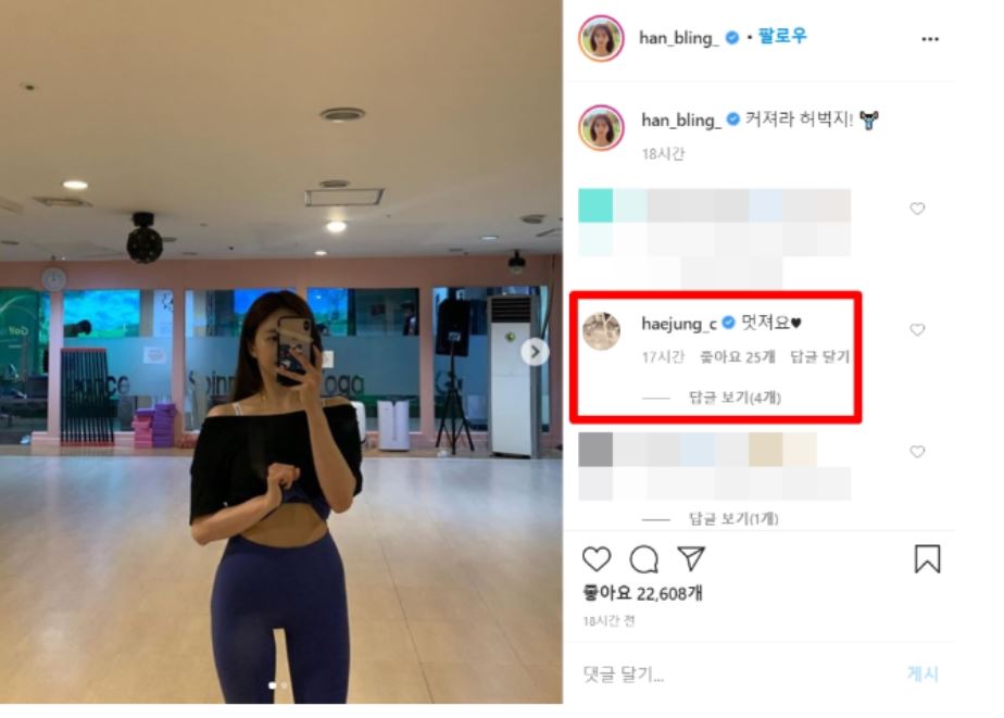 조혜정은 한보름 인스타그램 게시물에 "멋져요"라는 댓글을 남겼고, 한보름은 "금요일에 만나요"라며 친분을 과시했습니다.