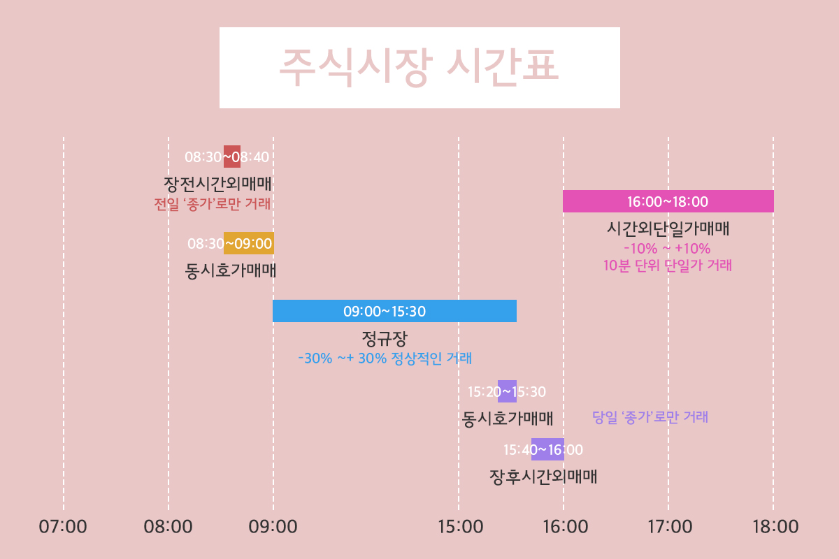 장전 시간외 거래는 08:30~08:40 에는 전일 종가로 거래가 이뤄지고 장 시작 동시호가는 08:30~09:00 에 이뤄집니다. 정규장은 주식 개장시간을 의미하고 장마감 동시호가는 15:20~15:30 이라고 말씀드렸습니다. 장후 시간외 거래는 15:40~16:00으로 단일 종가 거래가 됩니다. 시간외 단일가는 16:00~18:00 까지 가능합니다.