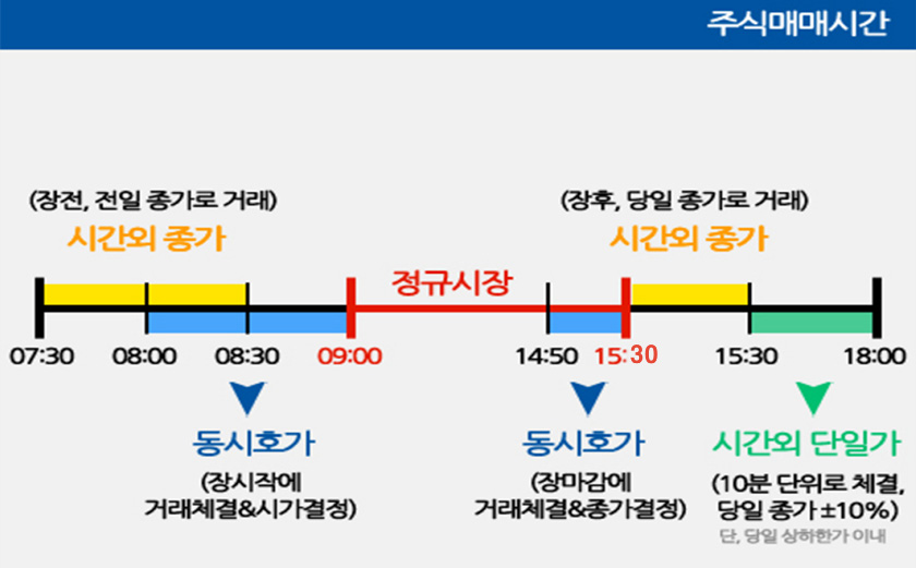 장전 시간외 거래는 08:30~08:40 에는 전일 종가로 거래가 이뤄지고 장 시작 동시호가는 08:30~09:00 에 이뤄집니다. 정규장은 주식 개장시간을 의미하고 장마감 동시호가는 15:20~15:30 이라고 말씀드렸습니다. 장후 시간외 거래는 15:40~16:00으로 단일 종가 거래가 됩니다. 시간외 단일가는 16:00~18:00 까지 가능합니다.