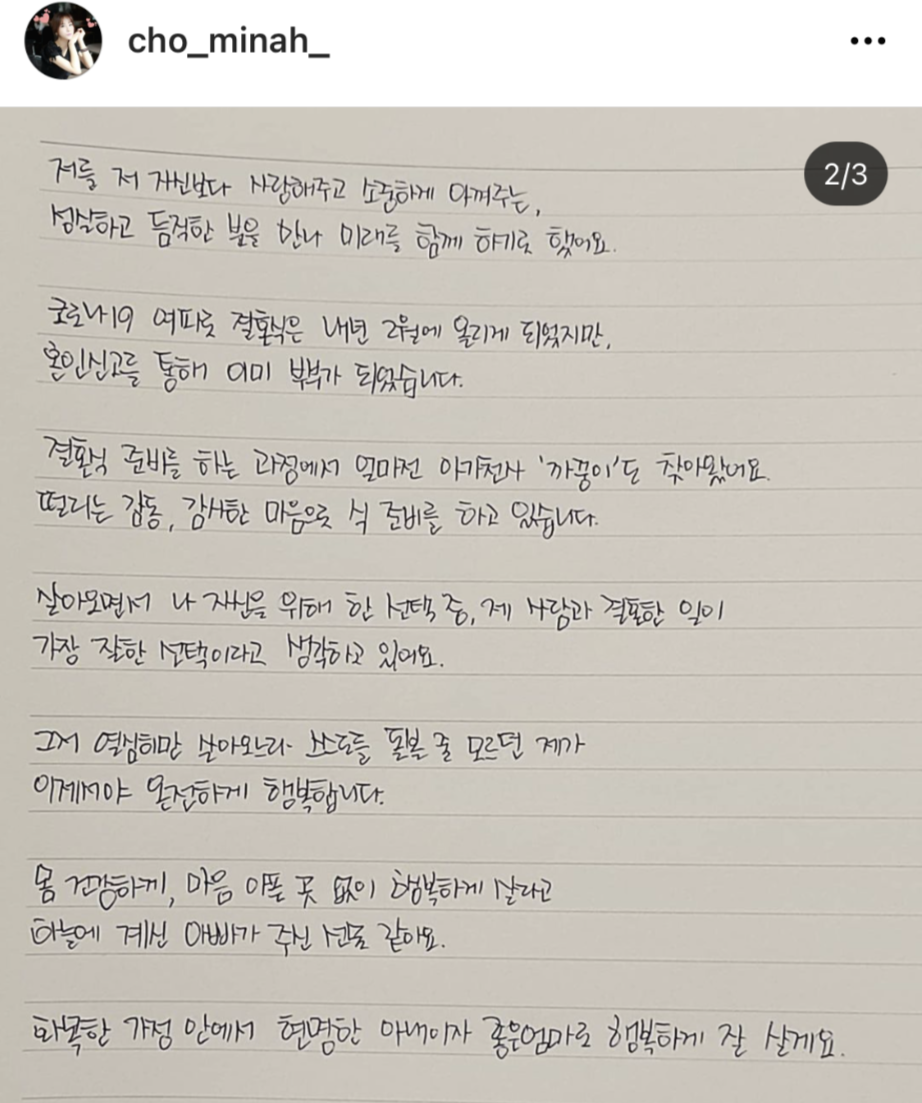 먼저 조민아는 "저와 허니베어를 실제로 보고도 '불화' 같은 단어를 떠올릴 수 있을까요?"라고 물은 후 "걱정과 응원 감사합니다만 벅차게 아낌 받는 아내이자, 서로밖에 없는 잉꼬부부입니다"라고 말했습니다.