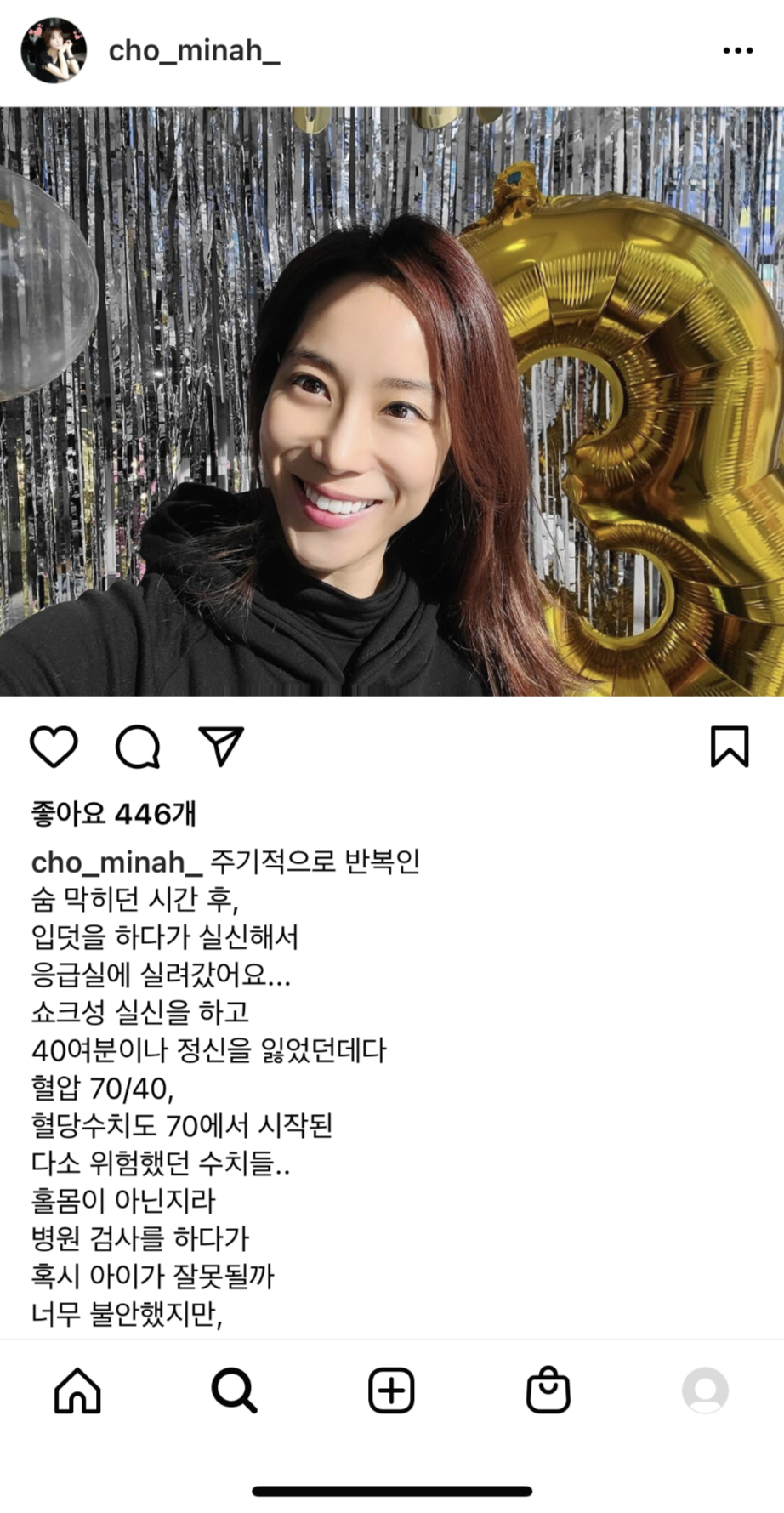 조민아는 16일 자신의 SNS에 "입덧을 하다가 실신해서 응급실에 실려갔다. 쇼크성 실신을 하고 40여분이나 정신을 잃었던 데다 혈압 70/40, 혈당 수치도 70에서 시작된 다소 위험했던 수치들"이라면서 "저혈압에 스트레스가 겹치면서 현재 몸 상태가 많이 좋지 않으니 입원 후 뇌파검사를 권유 받았지만 까꿍이를 생각하면 집이 아닌 사람이 모인 곳 자체가 위험하고 내 안정이 아이에게 좋을 것 같아 5시간 만에 집으로 왔다"고 말했습니다.