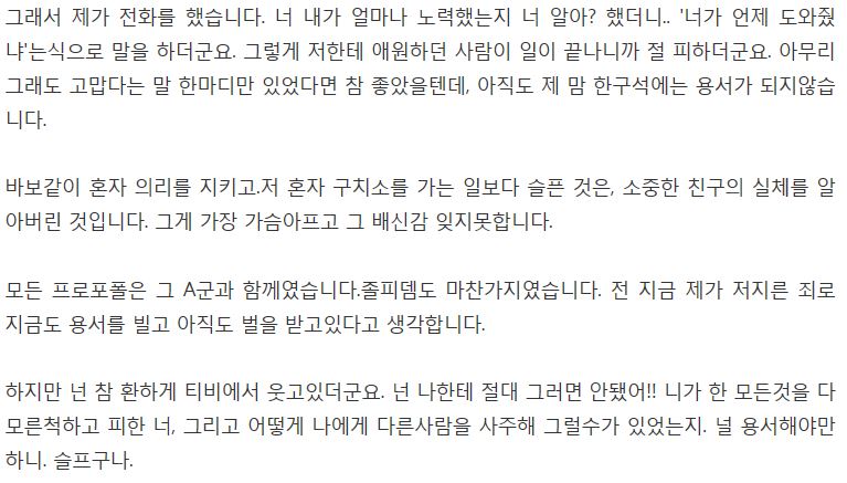 그러나 바로 작정이라도 한 듯 연예인 A군에 대한 이야기를 하면서 “모든 프로포폴은 그 연예인 A군과 함께였고 졸피뎀역시도도 마찬가지였다며 바보 같이 혼자 의리를 지키고 자기 혼자 구치소를 가는 일보다 슬픈 것은 그 친구의 실체를 알아버린 것이다”고 말했다.