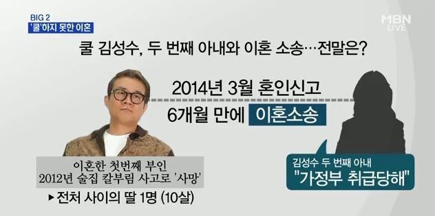 2013년 말 김성수는 재혼을 하게 되죠.  하지만 두번째 아내는 '김성수와 함께 사는 동안 생활비 한푼을 받지 못했다'며 가정부 취급을 받아 이혼을 결심하게 됐고 소송을 하여 이혼에 이르게 됩니다.