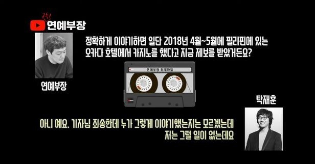 김씨는 이날 오후 자신의 유튜브 방송 ‘김용호 연예부장’에서 ‘탁재훈 도박, 결정적 증거 공개’라는 제목의 영상을 통해 “탁재훈이 반사적으로 법적 대응을 한다고 하는데 진짜 소송장 날릴 자신 없으면 그런 말 함부로 하는 것 아니다”라고 했다. 이어 탁재훈이 도박을 했다는 확실한 증거라며 동영상을 캡처한 사진 한 장을 공개했다.