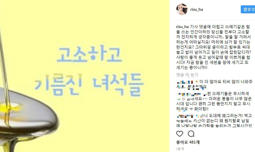 그리고 이어서 악플에 대해서 강하게 경고했습니다. " 기사 댓글에 더럽고 쓰레기같은 말들 쓰는 인간이하의 당신들 전부다 고소할까 진지하게 생각중이니까.. 말을 잘 가려서 하는게 어떠실지요! 머리에 뇌가 잘 있기는 한건지요? 그따위걸 글이라고 함부로 써대놓고 밥이 넘어가고 일이 손에 잡힌답디까? 사람이 좋게 웃고 넘어갈때 말 이쁘게들 합시다! 지금 참을 인 세번을 맘에 세기고 또 세기는 중이니까!! " 오죽하면 그녀가 고소라는 말을 꺼냈을까 합니다. 연예인이란 이유로 과도한 관심을 받고 편견의 시선으로 아픈 상처의 말들을 늘어놓는 사람들은 정말 너무하지요. 이혼을 결심하기까지 당사자들의 고민이 컸을텐데. 지나친 오지랖으로 이러쿵 저러쿵 말들을 늘어놓는 것은 잘못된 일입니다.