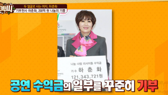 하춘화는 그동안 200억 원이 넘는 기부를 해온 것으로 알려져 있으며 기부에 대해 때마다 하는 게 아니라 연중무휴로 한다라며 “19살부터 기부를 했는데 그 당시 서울의 100평 집을 200~300만 원이면 샀다. 당시 공연비는 몇백에서 몇천이었다. 받으면 바로 현금으로 기부했다.”설명했습니다