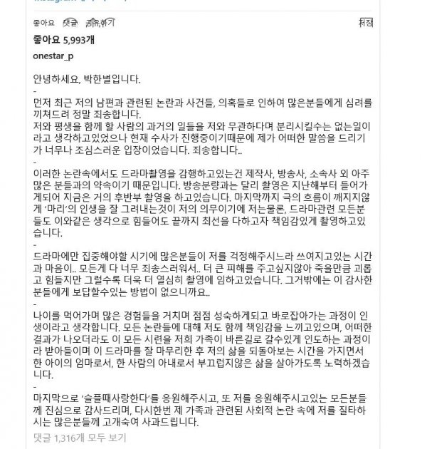 유 전 대표의 논란과 선을 그었던 박한별은 그 다음 날 “저와 평생을 함께할 사람의 과거 일들을 저와 무관하다며 분리할 수는 없는 일이라고 생각하고 있었으나 현재 수사가 진행 중이라 어떤 말씀을 드리기가 너무나 조심스러웠다”고 SNS를 통해 심경을 밝히기도 했다.